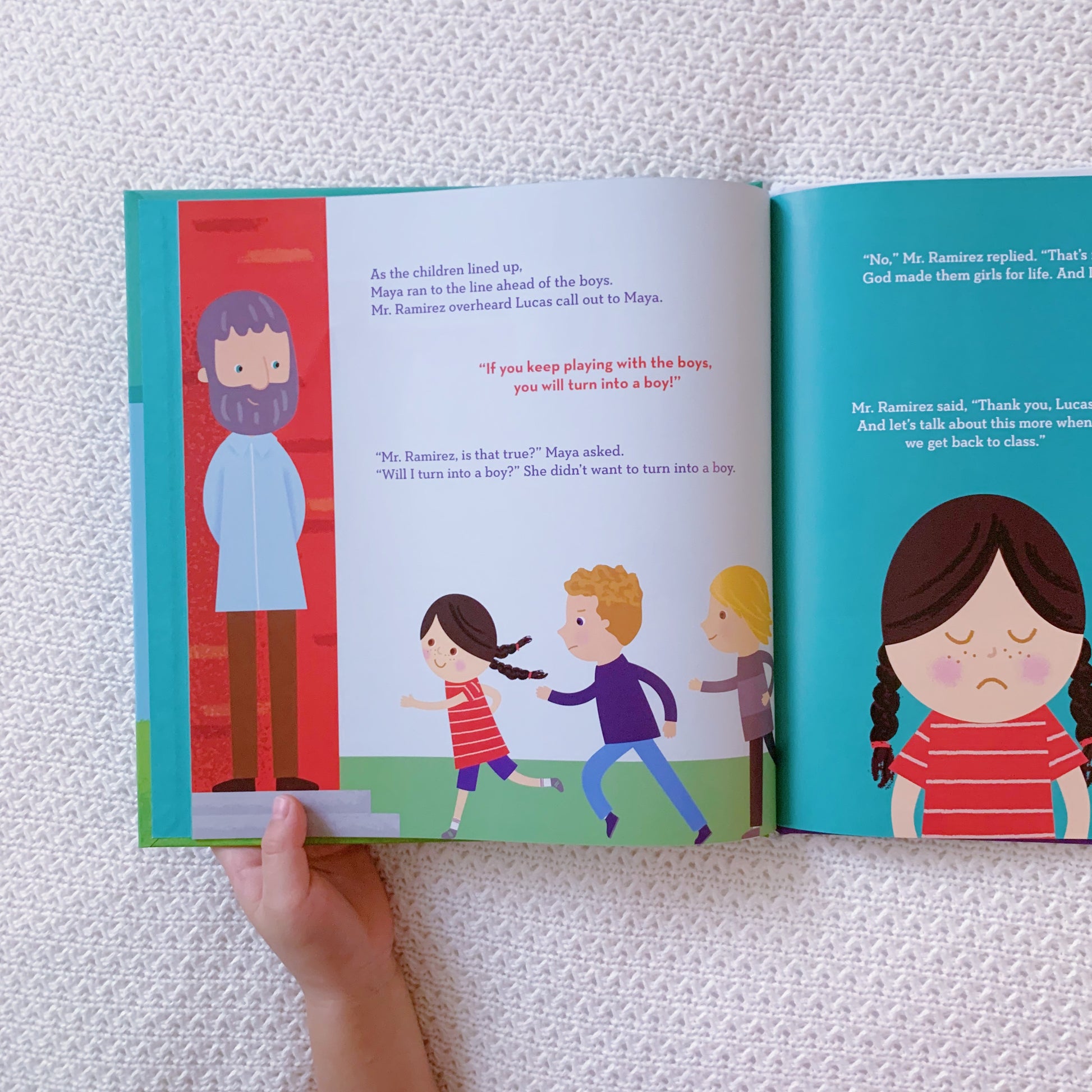 Their teacher explains that God gives each of us the gift of being male or female before we are born, and that you continue to be a boy or a girl whether you like to climb trees or play house, play tag or color pictures, cause a ruckus or sit quietly.