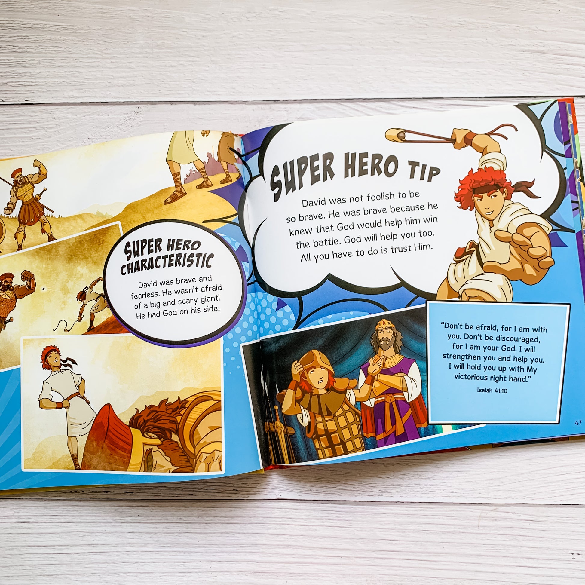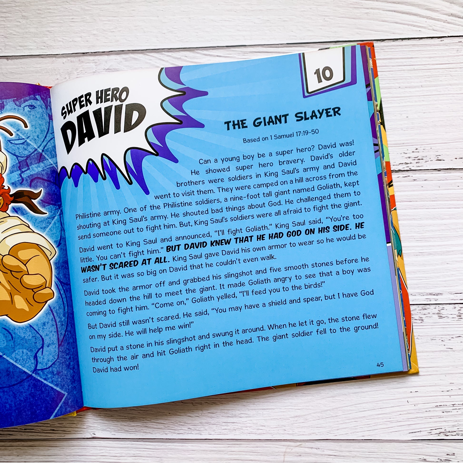 Each story includes a superhero comic style illustrations of the Bible character, the kid-friendly retelling of their story, the key superhero characteristic shown, a superhero tip on how to love like them and a key Bible verse from the story.