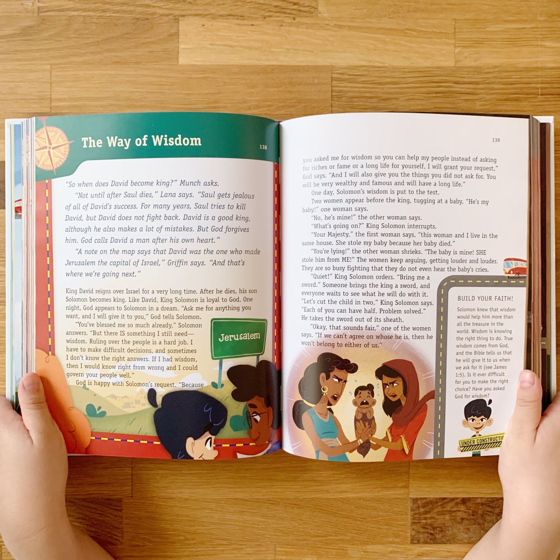 The Story Travelers Bible takes kids on a ride through 85 beloved Bible stories. Each story is told through the co text of 3 friends from current day who have traveled to the Bible stories and learn about the cultures, people and places of the Bible. Your kids will also be engaged by the vivid and beautiful illustrations depicting the stories. Each story will also be supplemented by discussion questions and key Bible Verses to help your little ones connect to God’s truth.