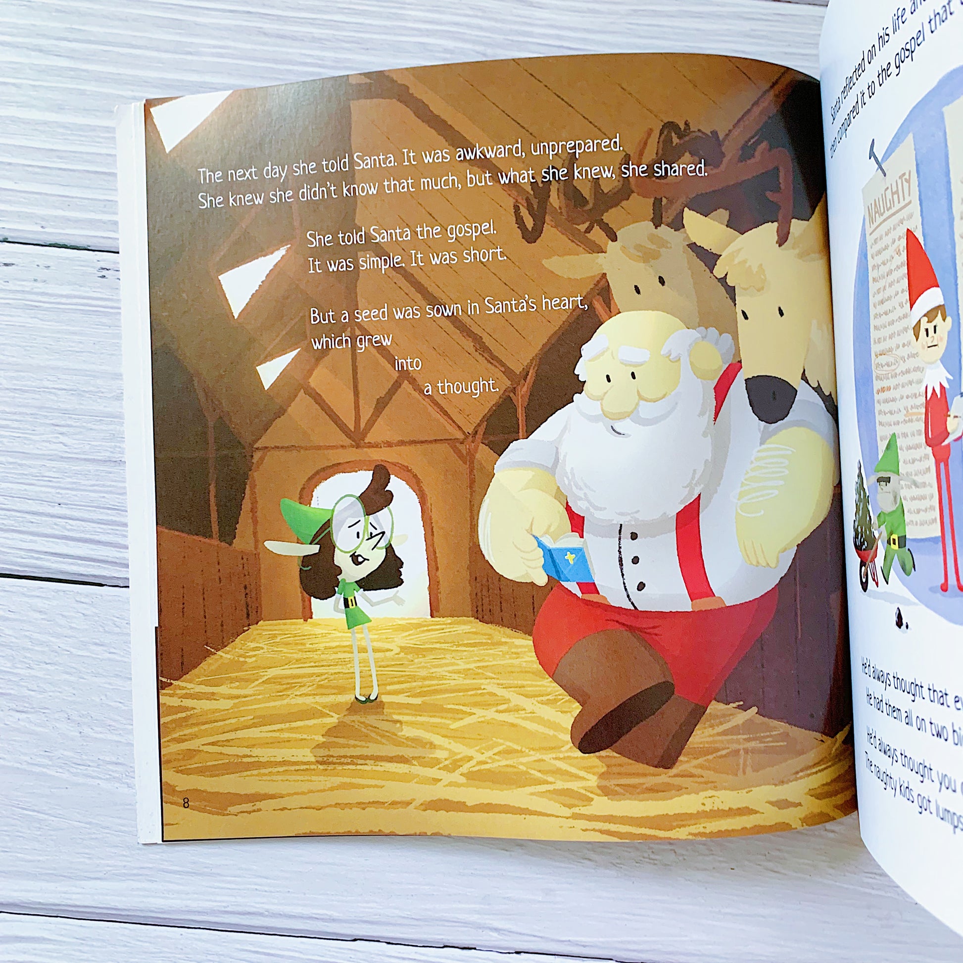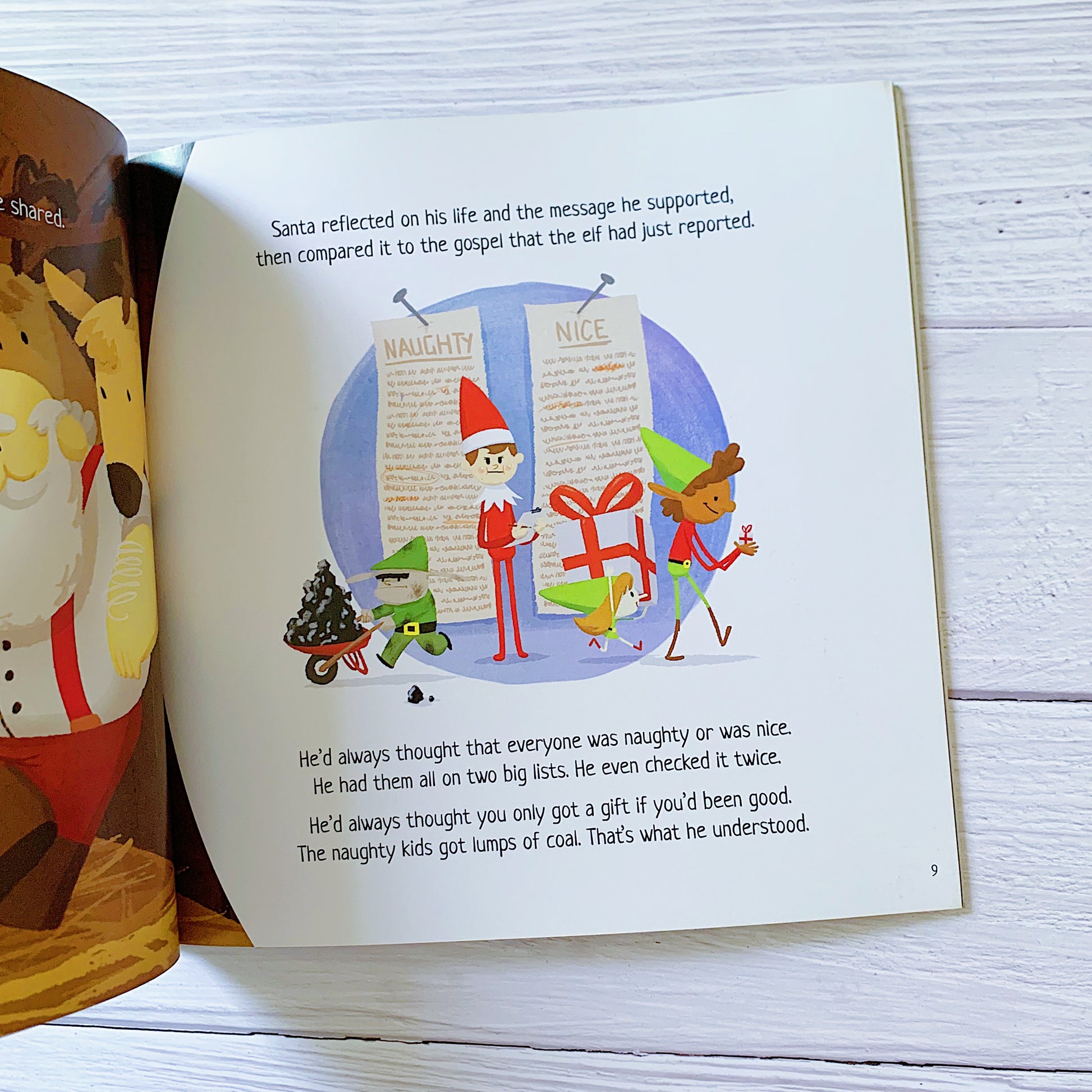 This sweet story begins with a little elf who decides to put her trust in Jesus as she looks through a Bible meant to be a little child's Christmas present. She then shares her new faith with Santa, who starts to think deeply about what it all means. As Santa compares the Gospel to his own 'naughty' or 'nice' list that he puts children on, he realises that no one is good, not even himself. Santa then goes on a journey of learning about God's mercy and forgiveness, and ultimately places his faith in Jesus.